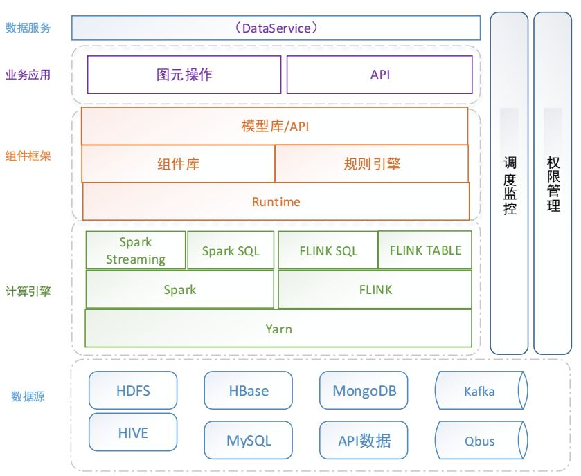 众所周知,第三代计算引擎主要特点是支持JOB内部DAG以及强调实时计算。在第三代计算引擎基础上,自主研发了DITTO组件框架和规则引擎,基于组件及计算的抽象提供丰富的组件库,采用图元拖拽的方式实现数据处理的无码化操作。同时通过调度监控以及权限管理,实现系统的自助运维以及数据安全的保障,值得一提的是,支持多种数据源接入,极大程度上满足各种数据类型及存储类型。