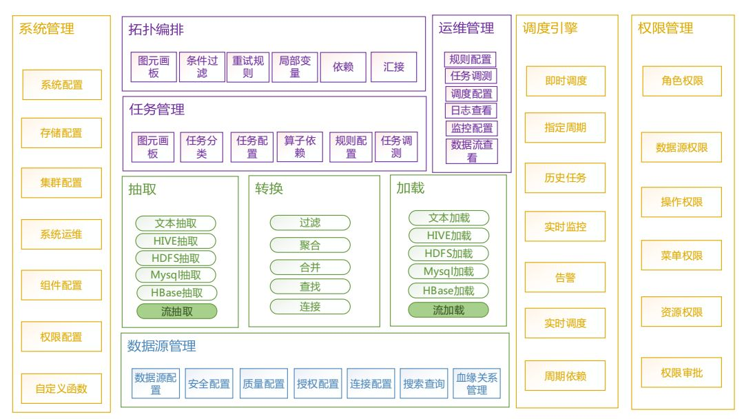 数据源管理实现了多数据源归一化处理,同时也提供了对数据安全和质量约束的保证。抽取和加载通过对各个存储引擎处理的抽象,实现了同时支持流式数据抽取和加载以及批数据抽取和加载。