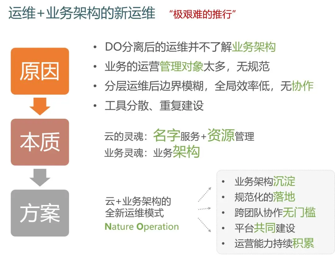 怎么做的呢?其实我们2010年的时候,正好在尝试做“自然运维”(和现在的Devops理念很像),研发和运维要分工、做配合,基于特定的一些流程去完成我们的日常工作和运维管理,包括现在所谓的交互链,我们当时没有把它包装成Devops这么高大上的名词。