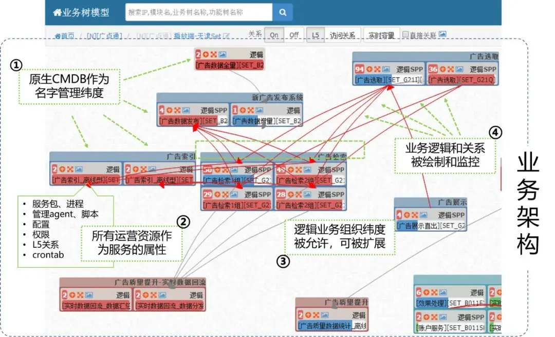 当时的理念是基于业务架构去运维。腾讯的业务挺复杂的,人员变动也很大,运维不熟悉业务架构往往是做好运维工作的障碍,于是我们和研发一起制定了关于业务架构的规范,研发团队会在我们规范出来的业务架构中去完成增加或减少、变更服务等的一系列任务,我们运维也会做一些系统把这个业务架构图展现出来,并管理起来。