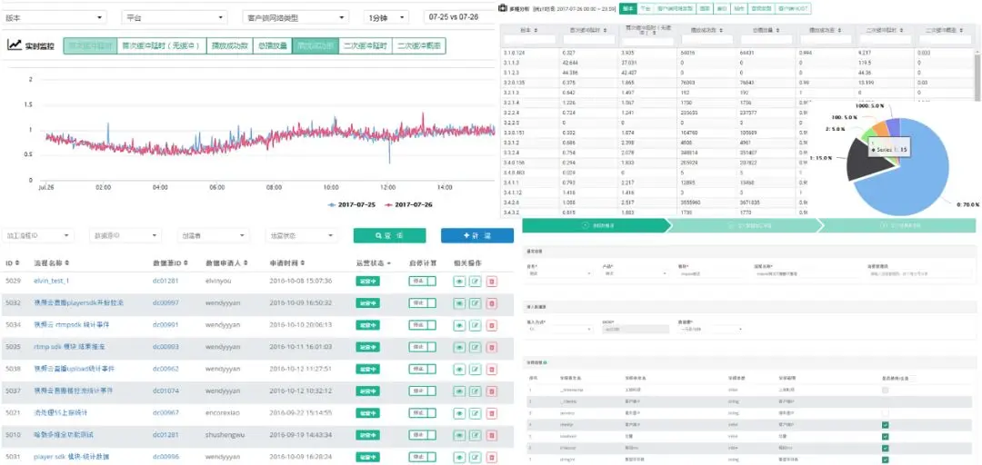 就像截图上看到的,可以用不同的维度组合去对产品各种方面的数据进行透视,这是我们的织云多维监控系统。数据可以选择不同的纬度组合来看,比如说版本、平台、客户端、网络制式还有省份等等,这些数据其实就是在我们同一条数据报上来之后,在织云多维里做的处理。在下面还可以看到首次缓冲率、二次缓冲率、首次加载的时长错误量等分纬度的数据。原来的监控的数据每次都要单独上报,现在通过一条就可以在系统里完美地落地,这也是我们现在主流的监控手段。