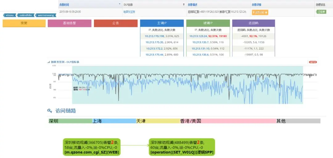 一旦告警出来,它会把这个告警发生的影响时间区间画出来,并绘制出和过去的同比变化;同时通过对多种维度进行聚类,会把是否有主调IP、被调IP、返回码汇聚等情况分析出来,也会把是否有版本发布、网络变更等事件关联起来。由于DLP告警本身很准,再加上告警出来后用户可以得这么多的辅助信息,用户自然会发现DLP非常有帮助。