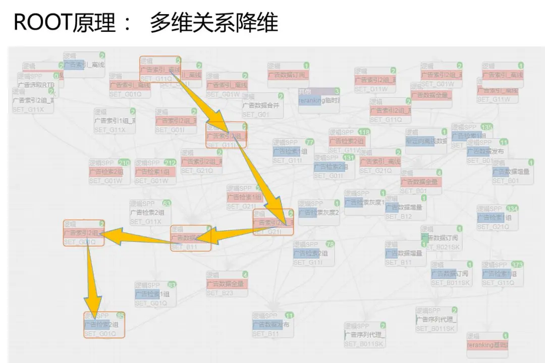 首先,什么是ROOT?我们现在把它叫做根源定位(有别于根因分析),我总结了一句话来描述它:基于业务架构,结合数据访问关系流,通过时间相关性、面积权重等算法,将监控告警进行筛选分类,发掘有业务价值的告警,并直接分析给出告警根源。