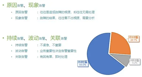 把我们的告警分为持续告警、波动告警和关联告警。这是2014年的数据,我们惊奇地发现在系统中有65%是持续的,代表了65%的告警数据极大可能是干扰,因为不明的原因而每天在告警。有24%的告警是波动告警,这种告警指标一会儿上去,没一会儿又下去了,可能是某个服务中断后恢复了,或者有某个产品进行版本发布,都有可能,但是最终是恢复了。运维也不需要去查,不需要关注。真正的我们系统能关联出来的告警只有9.2%,也就是不到10%的才是真正有问题,我们应该把运维的精力放到这里,绝大多数的告警运维都不需要花时间去查的,这是我们的数据分析。