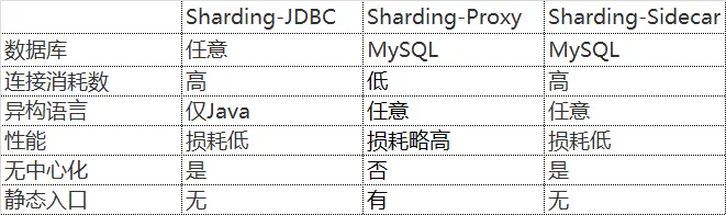与其他两个产品(Sharding-JDBC、Sharding-Sidecar)的对比: