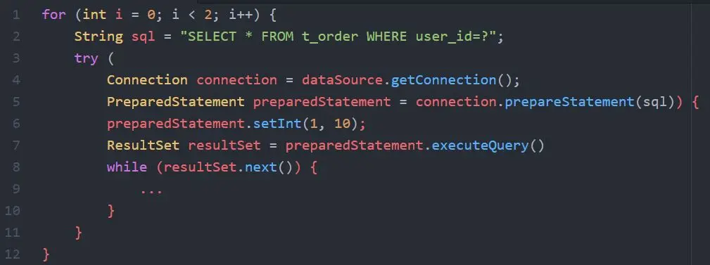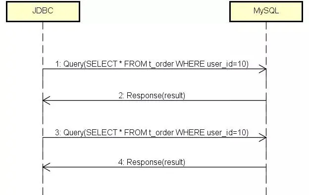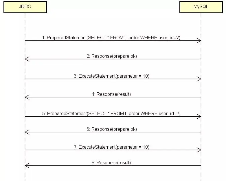 代码很容易理解,使用PreparedStatement执行两次查询操作,每次都把参数user_id设置为10。分析抓到的包,JDBC和MySQL之间的协议消息交互如下: