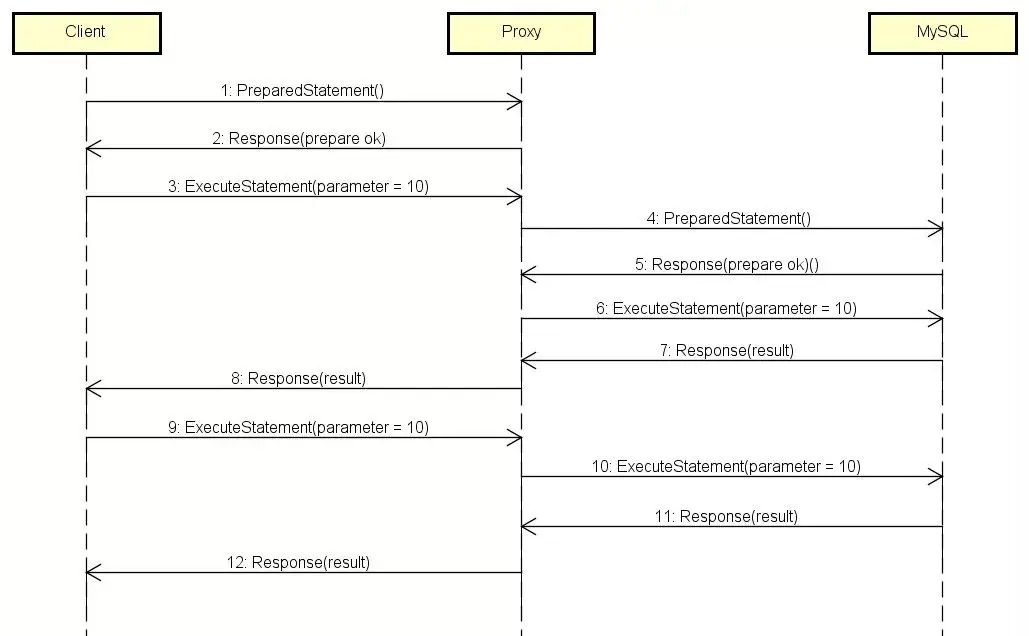 Proxy在收到Client的PreparedStatement的时候,并不会把这条消息转发给MySQL,因为SQL里的分片键是问号,Proxy不知道该路由到哪个真实数据库。Proxy收到这条消息后只是缓存了SQL,存储在一个StatementId到SQL的Map里面,等收到ExecuteStatement的时候才真正请求数据库。