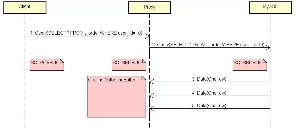 当ChannelOutboundBuffer满时,Proxy的SO_RCVBUF被打满,通知MySQL停止发送数据。