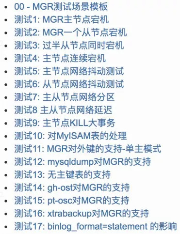 此外我们生产关心的问题,如网络抖动对MGR的影响、备份恢复工具可用性、Online-DDL可用性等,同样需要考虑在内。对此我们做了系统性的功能测试: