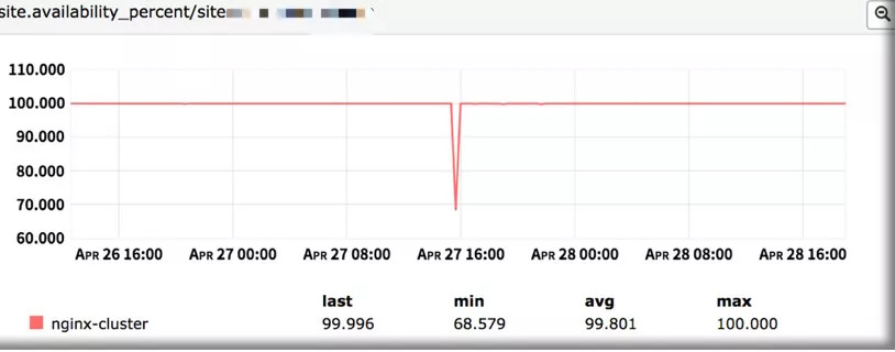 第二个问题发生在一次节点下线演练的过程中,DBA开始演练操作后,开发同学突然反馈说后台Nginx由于请求积压,机器挂掉了。如下图Nginx可用率: