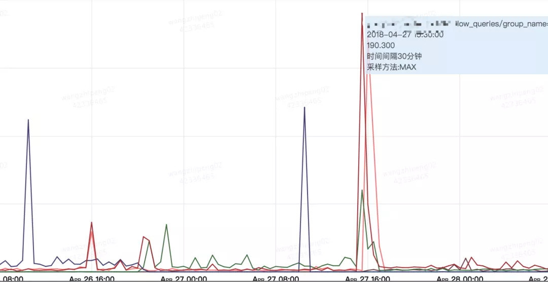 此时我们在DBA的慢查询监控中发现一个峰值,时间点基本吻合。下图为慢查询监控: