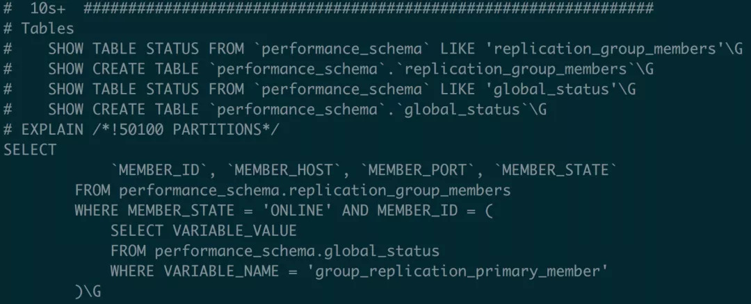 由此我们分析了这段时间的慢查询,发现这个SQL我们非常眼熟——MGR查询主节点的语句。正常这个SQL执行时间在毫秒级,故障当时执行了10s,而这个10s与stop group_replication这个操作的耗时基本吻合。