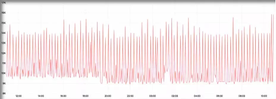 这个问题最初困扰了我们一段时间,通过对之前流程系统的对比,我们发现两个集群网卡的流量大小有些区别,且报表系统有比较明显的尖刺:
