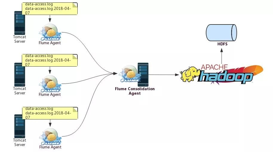 可以看到,不同的Web Server上都会部署一个Agent用于该Server上日志数据的采集,之后,不同Web Server的Flume Agent采集的日志数据会下沉到另外一个被称为Flume Consolidation Agent(聚合Agent)的Flume Agent上,该Flume Agent的数据落地方式为输出到HDFS。