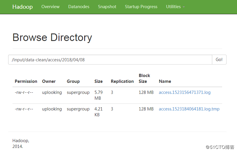 将上面的mr程序打包后上传到我们的Hadoop环境中,这里,对2018-04-08这一天产生的日志数据进行清洗,执行如下命令: