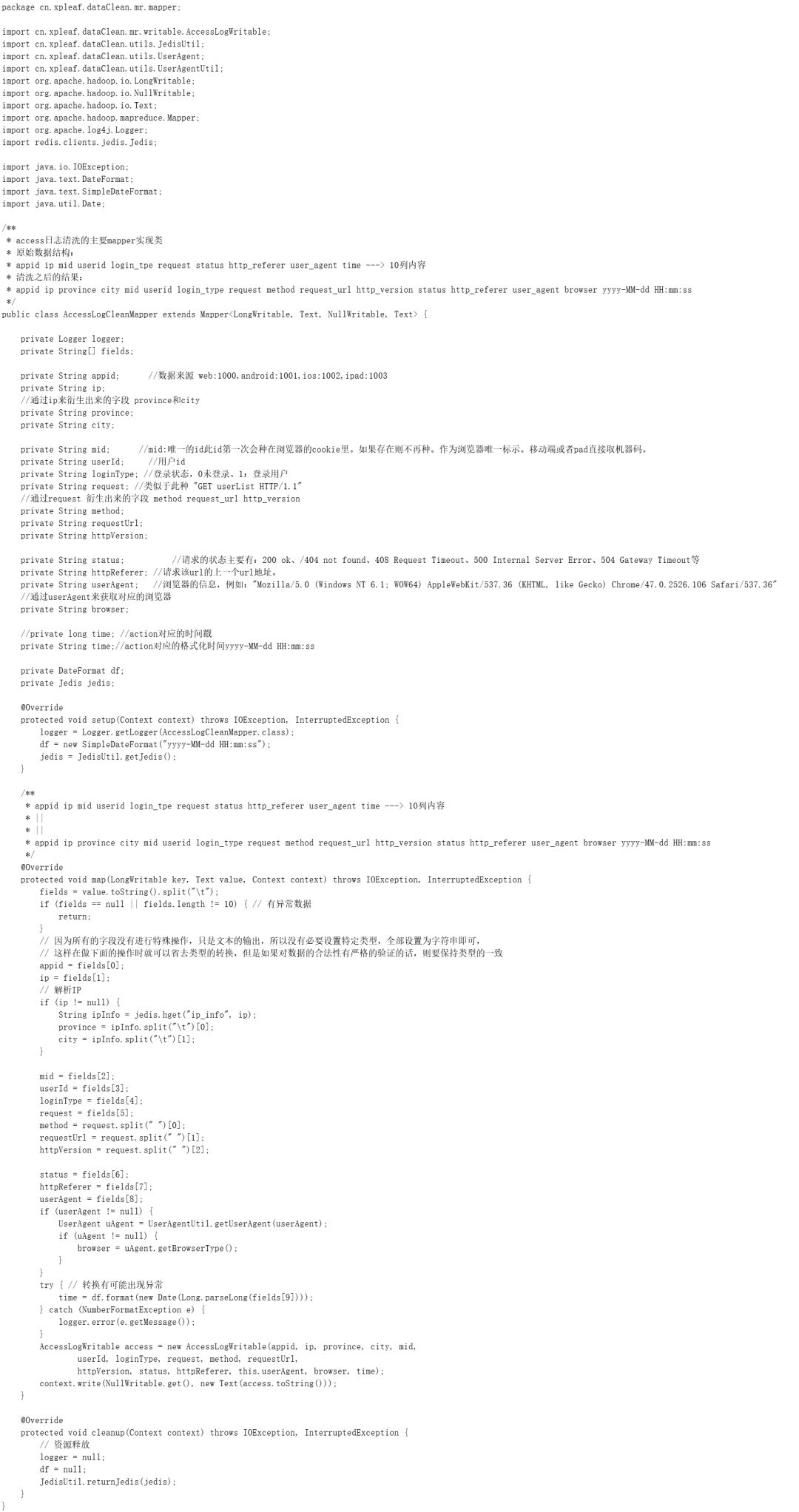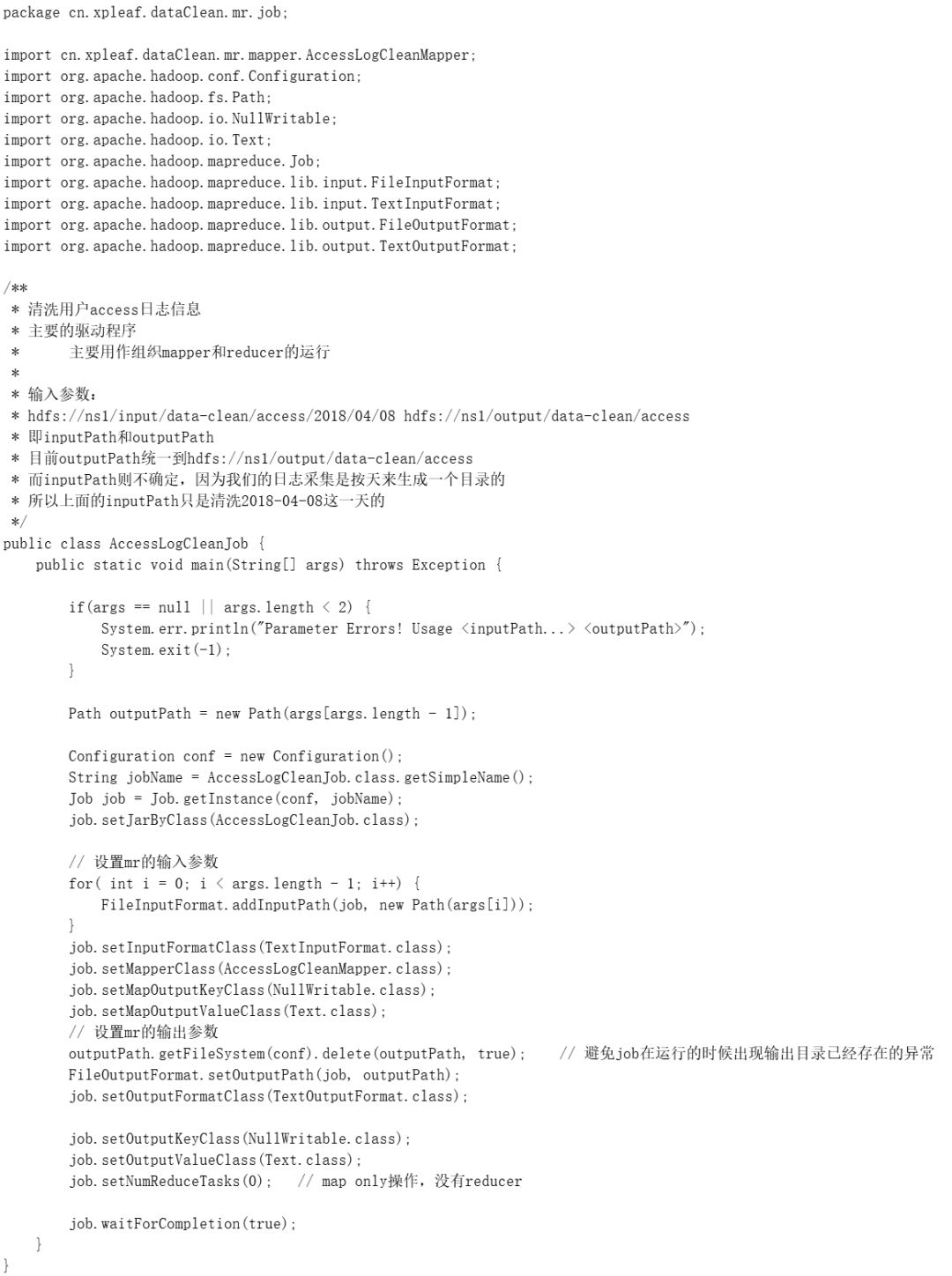 数据清洗的过程主要是编写MapReduce程序,而MapReduce程序的编写又分为写Mapper、Reducer、Job三个基本的过程。但是在我们这个案例中,要达到数据清洗的目的,实际上只需要Mapper就可以了,并不需要Reducer,原因很简单,我们只是预处理数据,在Mapper中就已经可以对数据进行处理了,其输出的数据并不需要进一步经过Redcuer来进行汇总处理。