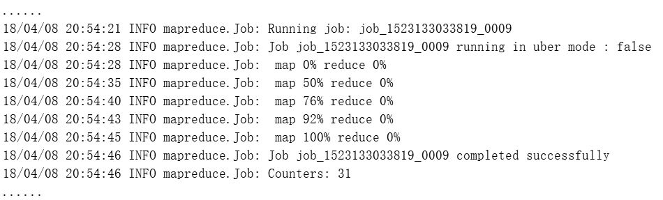 将上面的mr程序打包后上传到我们的Hadoop环境中,这里,对前面预处理之后的数据进行统计分析,执行如下命令: