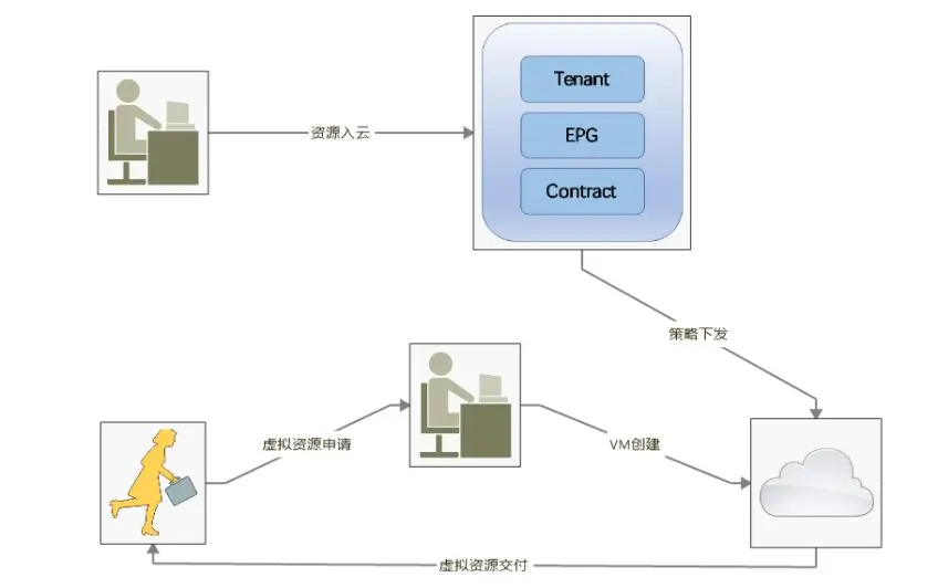 ACI,通过VM Networking与VCenter互相联动,并下发vNIC供虚拟机使用,虚拟机只需要选择对应虚拟网卡就可以进行业务上线。同时各个虚拟机对应的EPG通过合约的形式开通策略。在SDN中所有相同业务都部署在同一个EPG中,所有策略的开通并不是基于IP地址来开通,只需要在不通的EPG之间开通策略即可,所以无需像传统网络进行IP对应的策略开放方式进行SDN网络策略开通。虚拟化资源可以在任意宿主机上进行创建、迁移,没有任何的物理位置的限制。
