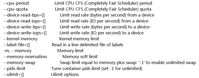 docker run -tid –name ec2 –cpuset-cpus 3 –cpu-shares 2048 -memory 2048m –rm –blkio-weight 100 --pids--limit 512