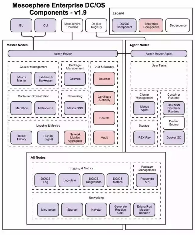 后来DC/OS在最基础的Marathon和Mesos之上添加了很多的组件,如图所示,现在已经非常丰富,例如DCOS的客户端(kubectl)、API网关admin router(类似apiserver)、服务发现minuteman(类似kube-proxy)、Pod的支持、CNI插件的支持、存储插件的支持等,和Kubernetes已经非常像了。