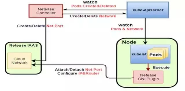 网易云开发了自己的NeteaseController,在监听到有新的Pod创建时,调用IaaS的API创建IaaS层的虚拟网卡,然后在虚拟机内部,通过调用Netease CNI插件将虚拟网卡添加到容器里面。添加技术用的就是上一节提到的setns命令。