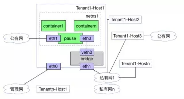 通过这个图我们可以看出,容器的网卡是直接连接到虚拟私有网络的OVS上的,和虚拟机是一个平的二层网络,在OVS来看,容器和虚拟机是在同一个网络里面的。