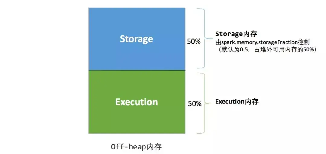 堆外的空间分配较为简单,只有存储内存和执行内存,如图 3 所示。可用的执行内存和存储内存占用的空间大小直接由参数 spark.memory.storageFraction 决定,由于堆外内存占用的空间可以被精确计算,所以无需再设定保险区域。