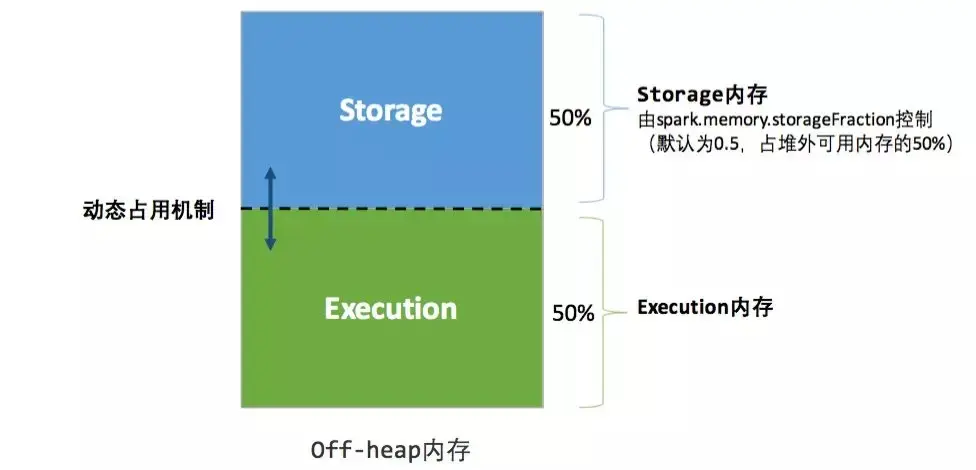 在默认情况下堆外内存并不启用,可通过配置 spark.memory.offHeap.enabled 参数启用,并由 spark.memory.offHeap.size 参数设定堆外空间的大小。除了没有 other 空间,堆外内存与堆内内存的划分方式相同,所有运行中的并发任务共享存储内存和执行内存。