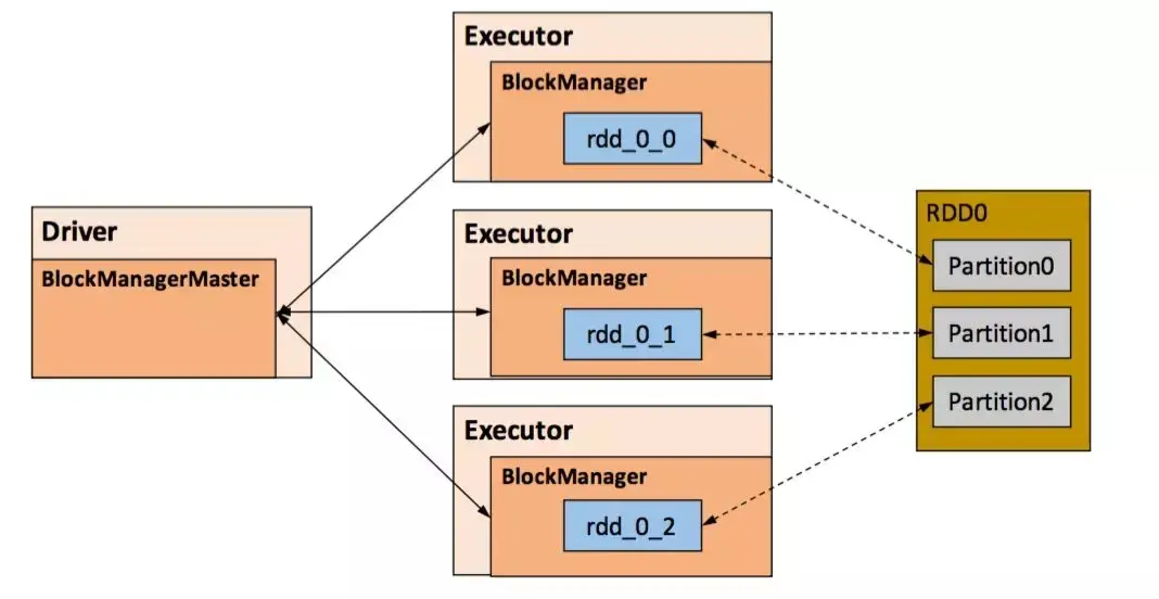 RDD 的持久化由 Spark 的 Storage 模块 [7] 负责,实现了 RDD 与物理存储的解耦合。Storage 模块负责管理 Spark 在计算过程中产生的数据,将那些在内存或磁盘、在本地或远程存取数据的功能封装了起来。在具体实现时 Driver 端和 Executor 端的 Storage 模块构成了主从式的架构,即 Driver 端的 BlockManager 为 Master,Executor 端的 BlockManager 为 Slave。Storage 模块在逻辑上以 Block 为基本存储单位,RDD 的每个 Partition 经过处理后唯一对应一个 Block(BlockId 的格式为 rdd_RDD-ID_PARTITION-ID )。Master 负责整个 Spark 应用程序的 Block 的元数据信息的管理和维护,而 Slave 需要将 Block 的更新等状态上报到 Master,同时接收 Master 的命令,例如新增或删除一个 RDD。