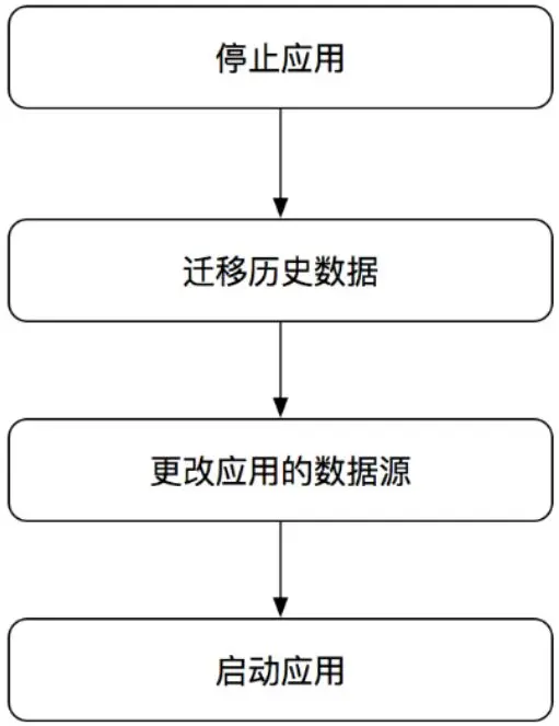 停机迁移的方法比较简单,通常分为停止应用、迁移历史数据、更改应用的数据源、启动应用这4个步骤,如图14所示: