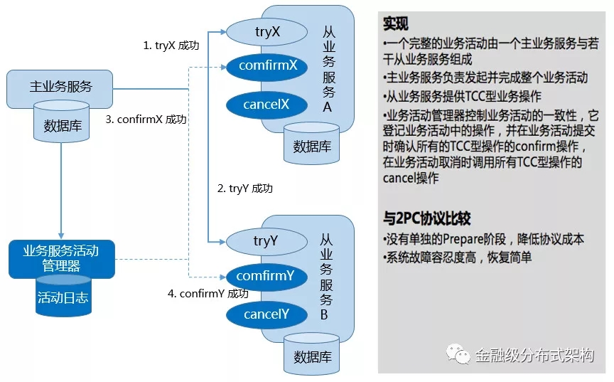 蚂蚁技术团队借鉴了BASE理论(Basically Available、Soft State、Eventual Consistency 基本可用、软状态、最终一致性),设计了基于 TCC(Try Confirm Cancel)模型的两阶段的柔性事务框架,在保证单机事务的 ACID 原则的前提下确保全局分布式事务的最终一致性,在保证用户体验(性能)的前提下让客户感受到了一致性,并向用户屏蔽了短暂不一致(故障或者延迟)的恢复细节,满足了业务上对一致性的要求。