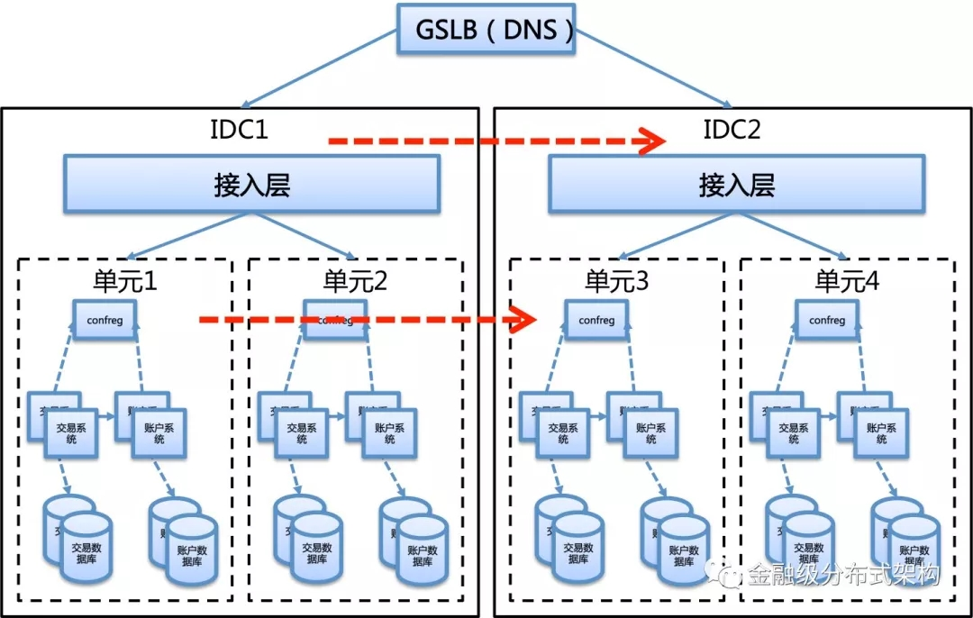 从接入层开始,把原来部署在一个 IDC 中的系统集群,进一步分成多个更细粒度的部署单元,从而达到机房级别的扩展。这种机房架构在容灾方面的优势会在第五个小节中展开说明。
