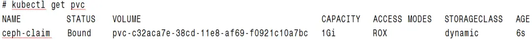 我们看到ceph-claim这个PVC已经绑定到了pvc-c32aca7e-38cd-11e8-af69-f0921c10a7bc这个PV,而该PV是由名为dynamic的storageclass动态创建的。
