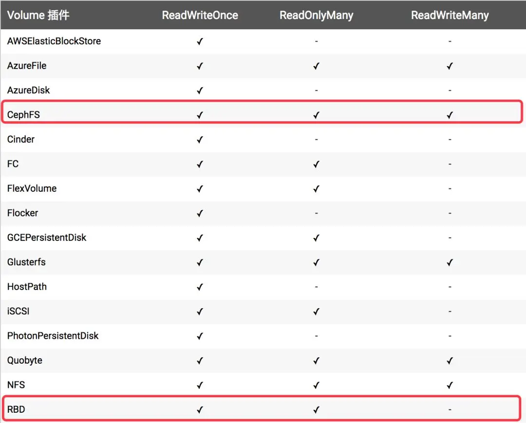 在说明Ceph RBD缺点之前,先介绍下PV的访问模式,PV支持三种访问模式: