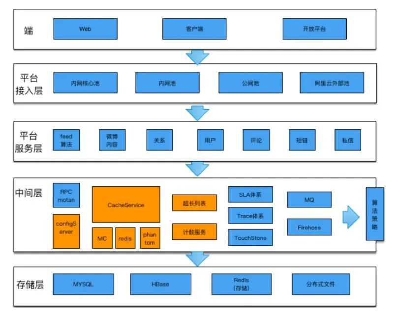 Feed平台系统架构总共分为五层,最上面是端层,比如web端、客户端、大家用的IOS或安卓的一些客户端,还有一些开放平台、第三方接入的一些接口;下一层是平台接入层,不同的池子,主要是为了把好的资源集中调配给重要的核心接口,这样遇到突发流量的时候,就有更好的弹性来服务,提高服务稳定性。再下面是平台服务层,主要是Feed算法、关系等等。接下来是中间层,通过各种中间介质提供一些服务。最下面一层就是存储层。