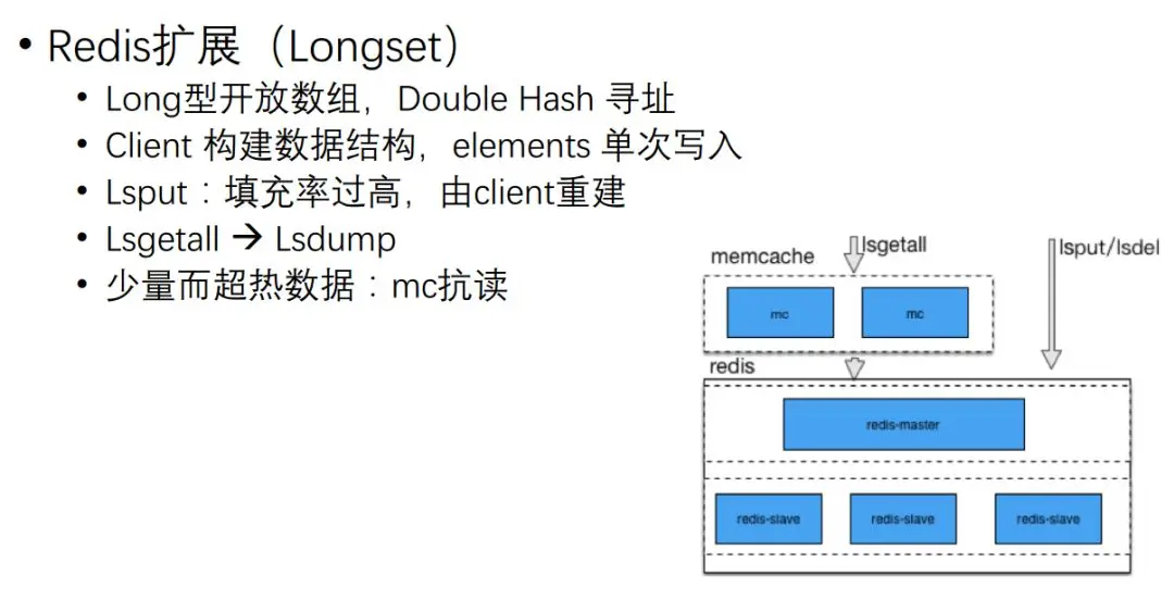 这时存在一个问题,因为Redis工作机制是单线程模式,如果它加某一个UV,关注2000个用户,可能扩展到两万个UID,两万个UID塞回去基本上Redis就卡住了,没办法提供其他服务。所以我们扩展一种新的数据结构,两万个UID直接开了端,写的时候直接依次把它写到Redis里面去,读写的整个效率就会非常高。它的实现是一个long型的开放数组,通过Double Hash进行寻址。