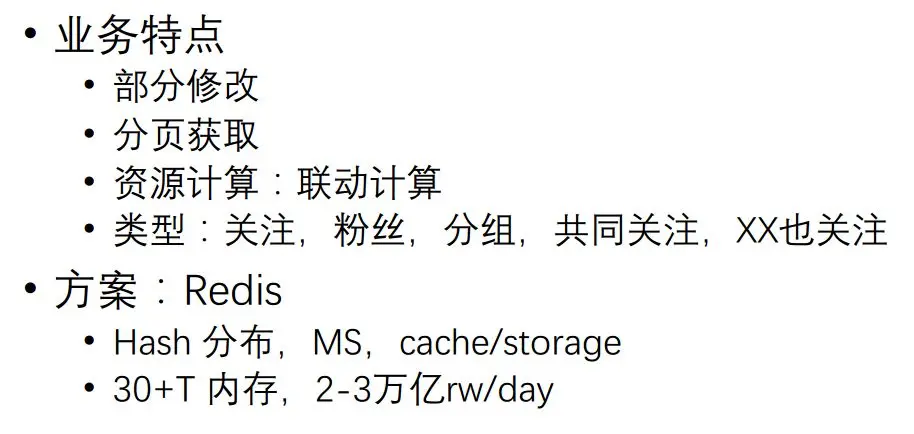 各种关注关系都存在Redis里面取,通过Hash分布、储存,一组多存的方式来进行读写分离。现在Redis的内存大概有30个T,每天都有2-3万亿的请求。