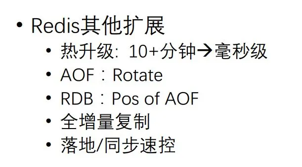 对于AOF,我们采用滚动的AOF,每个AOF是带一个ID的,达到一定的量再滚动到下一个AOF里去。对RDB落地的时候,我们会记录构建这个RDB时,AOF文件以及它所在的位置,通过新的RDB、AOF扩展模式,实现全增量复制。