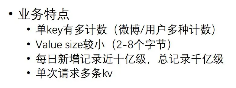 接下来还有一些其他的数据类型,比如一个计数,实际上计数在每个互联网公司都可能会遇到,对一些中小型的业务来说,实际上MC和Redis足够用的,但在微博里计数出现了一些特点:单条Key有多条计数,比如一条微博,有转发数、评论数,还有点赞;一个用户有粉丝数、关注数等各种各样的数字。因为是计数,它的Value size是比较小的,根据它的各种业务场景,大概就是2-8个字节,一般4个字节为多,然后每日新增的微博大概十亿条记录,总记录就更可观了,然后一次请求,可能几百条计数要返回去。