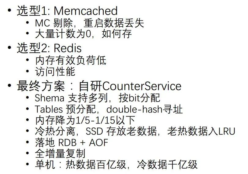 后来我们通过自己研发的Counter Service,内存降至Redis的五分之一到十五分之一以下,而且进行冷热分离,热数据存在内存里,冷数据如果重新变热,就把它放到LRU里去。落地RDB、AOF,实现全增量复制,通过这种方式,热数据单机可以存百亿级,冷数据可以存千亿级。