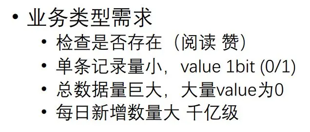 除了计数,微博还有一些业务,一些存在性判断。比如一条微博展现的,有没有点赞、阅读、推荐,如果这个用户已经读过这个微博了,就不要再显示给他。这种有一个很大的特点,它检查是否存在,每条记录非常小,比如Value1个bit就可以了,但总数据量巨大。比如微博每天新发表微博1亿左右,读的可能有上百亿、上千亿这种总的数据需要判断。怎么来存储是个很大的问题,而且这里面很多存在性就是0。还是前面说的,0要不要存?如果存了,每天就存上千亿的记录;如果不存,那大量的请求最终会穿透Cache层到DB层,任何DB都没办法抗住那么大的流量。