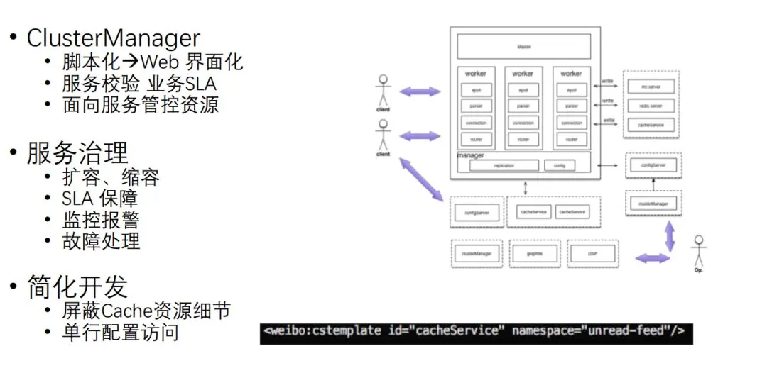 服务化还引入Cluster Manager,实现对外部的管理,通过一个界面来进行管理,可以进行服务校验。服务治理方面,可以做到扩容、缩容,SLA也可以得到很好的保障。另外,对于开发来说,现在就可以屏蔽Cache资源。
