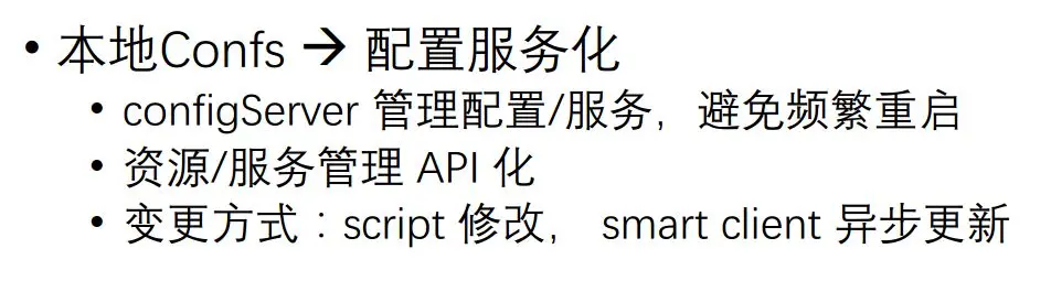 采取的方案首先就是对整个Cache进行服务化管理,对配置进行服务化管理,避免频繁重启,另外如果配置发生变更,直接用一个脚本修改一下。
