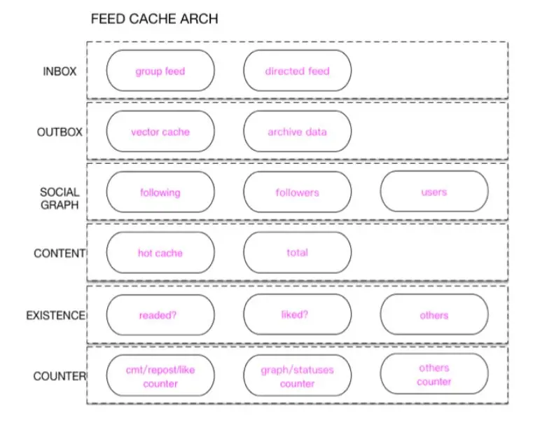 接下来我们看一下Cache架构,它主要分为六层。首先第一层是Inbox,主要是分组的一些微博,然后直接对群主的一些微博。Inbox比较少,主要是推的方式。