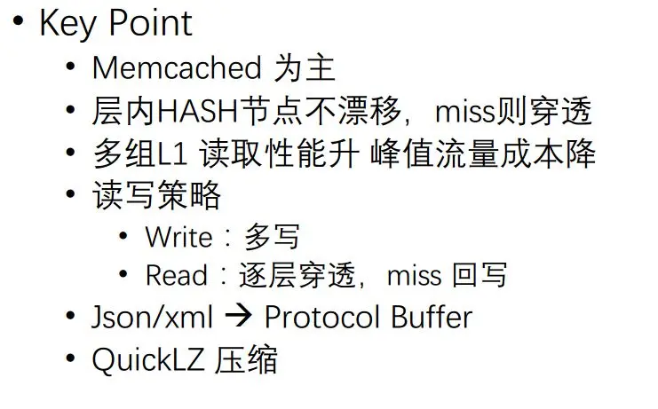 简单总结一下,通过简单KV数据类型的存储,我们实际上以MC为主的,层内HASH节点不漂移,Miss穿透到下一层去读取。通过多组L1读取性能提升,能够抗住峰值、突发流量,而且成本会大大降低。对读写策略,采取多写,读的话采用逐层穿透,如果Miss的话就进行回写。对存在里面的数据,我们最初采用Json/xml,2012年之后就直接采用Protocol Buffer格式,对一些比较大的用QuickL进行压缩。