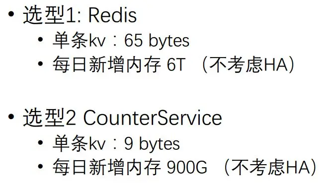 我们也进行了一些选型,首先直接考虑能不能用Redis。单条KV 65个字节,一个KV可以8个字节的话,Value只有1个bit,这样算下来每日新增内存有效率是非常低的。第二种我们新开发的Counter Service,单条KV Value1个bit,我就存1个byt,总共9个byt就可以了。这样每日新增内存900G,存的话可能就只能存最新若干天的,存个三天差不多快3个T了,压力也挺大,但比Redis已经好很多。