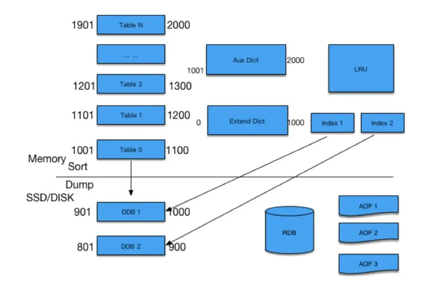 有些人疑问说,如果在某个范围内,我的ID本来设的计数是4个字节,但是微博特别热,超过了4个字节,变成很大的一个计数怎么处理?对于超过限制的,我们把它放在Aux dict进行存放,对于落在SSD里的Table,我们有专门的IndAux进行访问,通过RDB方式进行复制。