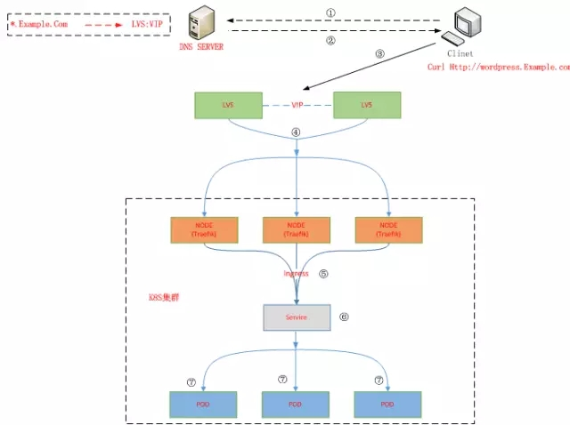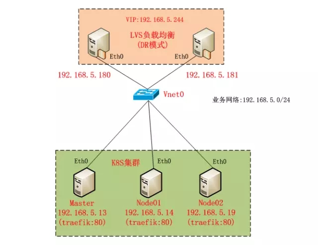 后端三台服务器组成Kubernetes集群,每台节点使用hostPort 的方式部署traefik容器,traefik监听节点的80端口,前端LVS负载均衡监听后端三台Kubernetes节点的80端口将外部访问负载分担至traefik。