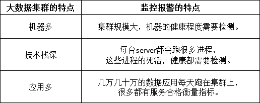 (图示为针对大数据集群的不同特性,监控报警的特点)