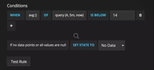 基于规则表达式的,在熟悉了表达式语言后,比较容易编写,但灵活性差。在实现复杂的报警规则时比较难,一般适用于简单的报警规则,比如当某一、二个观测指标到达阈值时触发。例如: